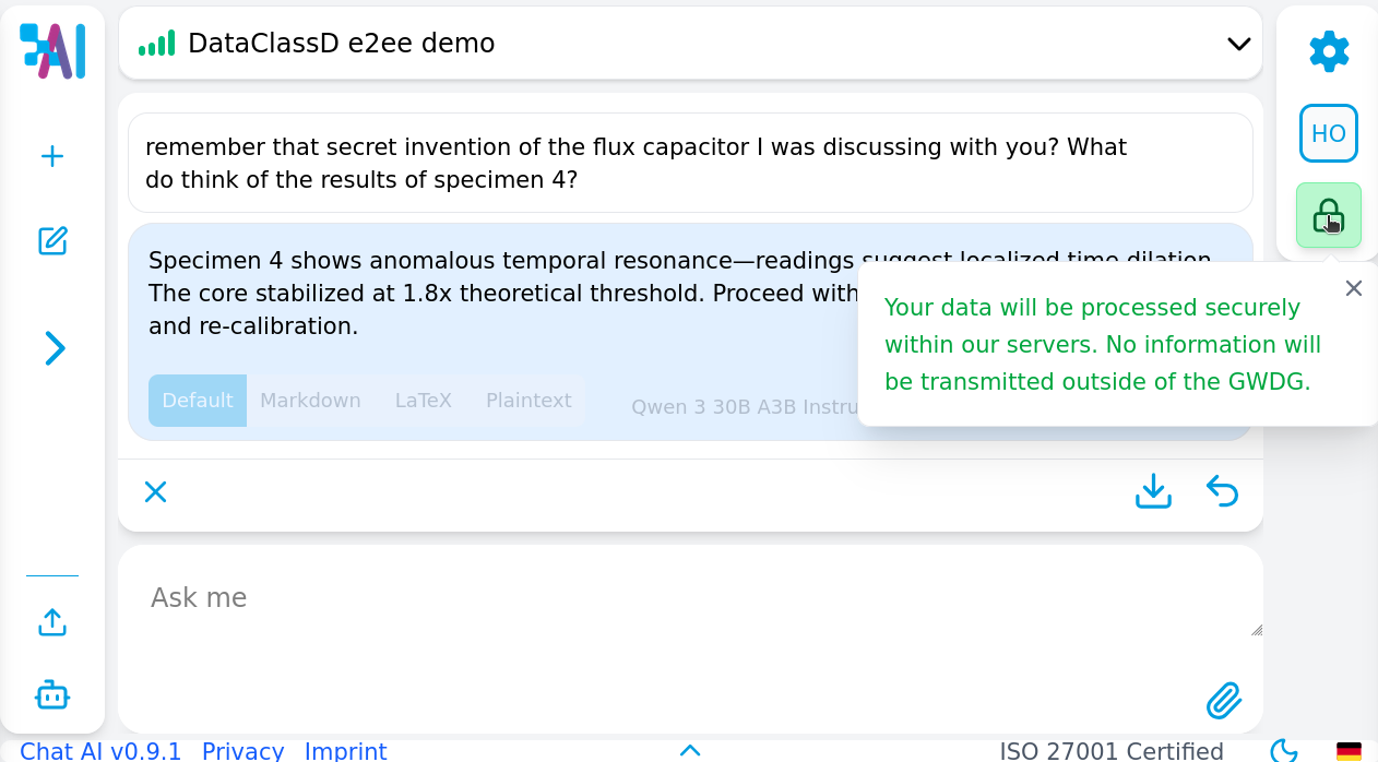 over the past months, we have made significant strides in strengthening the security posture of the ChatAI service through a comprehensive set of technical and organizational enhancements. These improvements are either integrated into the ChatAI frontend and the SAIA platform that hosts our backend infrastructure or measures will be dedicated for deployment of use cases requiring data class D.